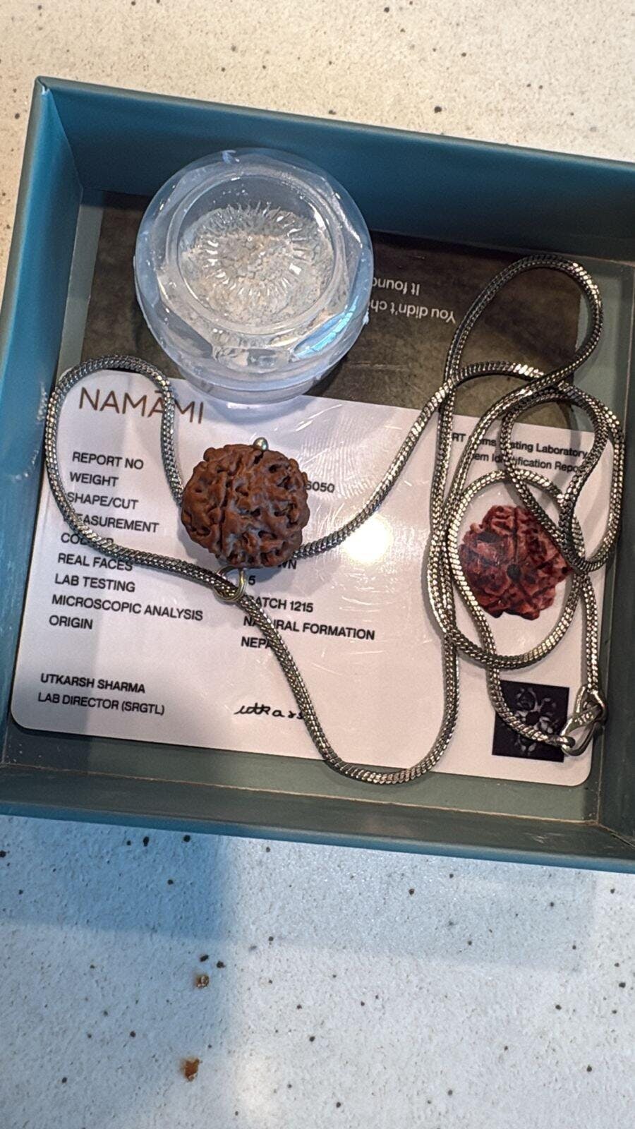 Package Contents: Authentic 5 Mukhi Rudraksha (Nepal Origin), Lab Certificate, Stainless Steel Chain, Energised Vibhuti from Kashi.