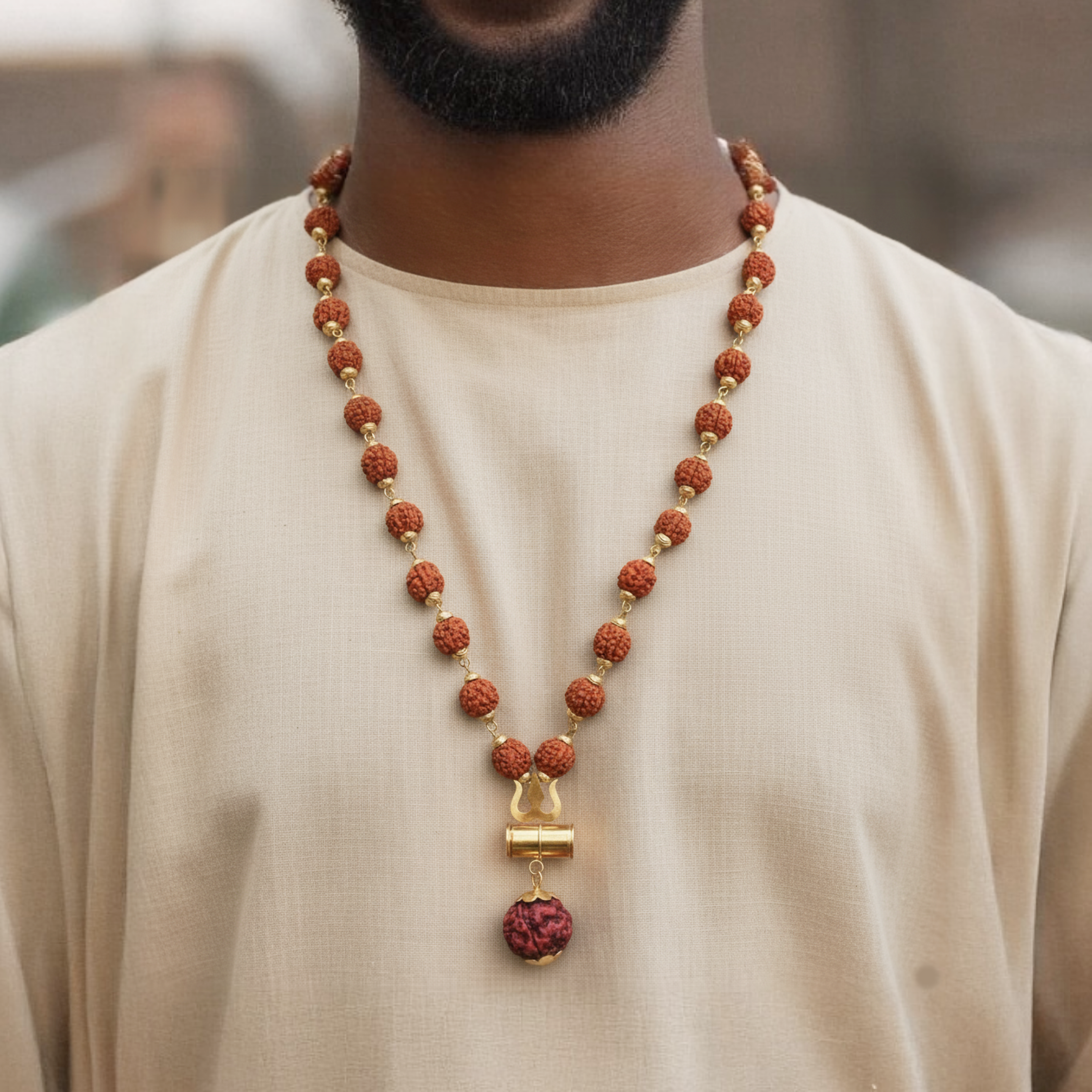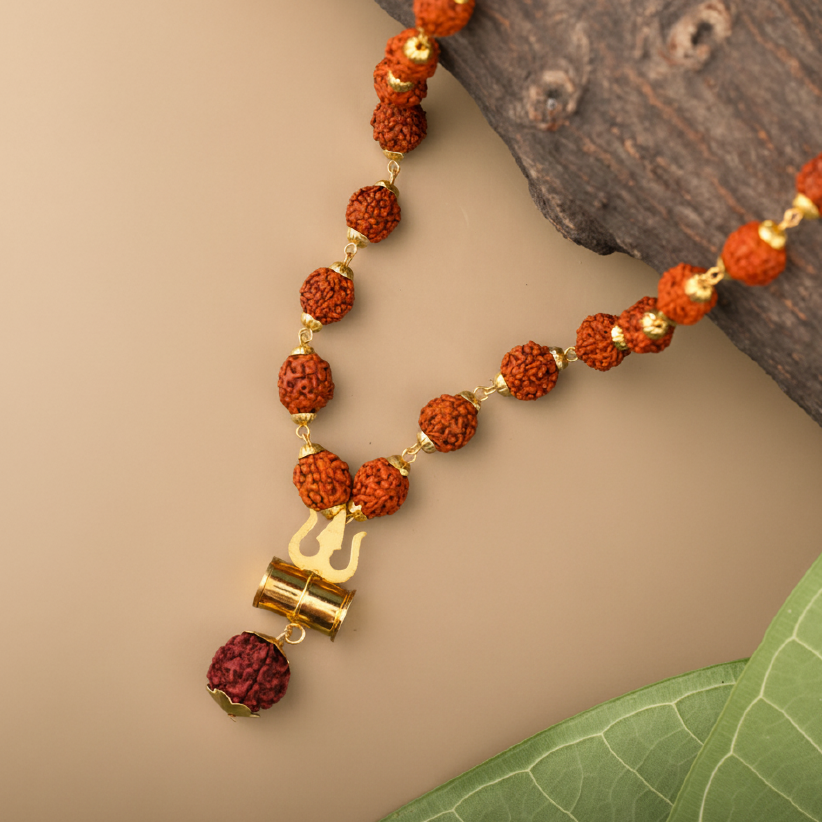 The Gold Plated  Rudraksha Trishool Necklace is a divine representation of Lord Shiva’s energy — a symbol of protection, cosmic balance, and spiritual awakening. Crafted with genuine 5 Mukhi Rudraksha beads and a gold-plated Trishool and Damroo pendant, this sacred necklace unites tradition, power, and elegance..